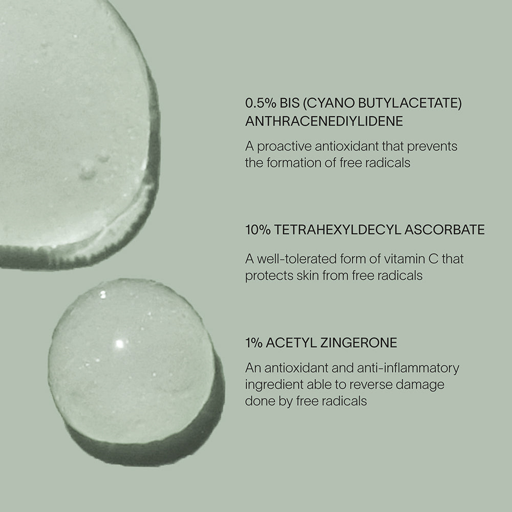 - Aqua/Water/Eau, Propanediol, Tetrahexyldecyl Ascorbate, Leuconostoc/Radish Root Ferment Filtrate, Lactobacillus, Cocos Nucifera (Coconut) Fruit Extract, Squalane, Glycerin, Bis(Cyano Butylacetate) Anthracenediylidene, Acetyl Zingerone, Sodium Hyaluronate, Niacinamide, Allantoin, Cetearyl Olivate, Sorbitan Olivate, Tocopheryl Acetate, C9-12 Alkane, Xanthan Gum, Citric Acid