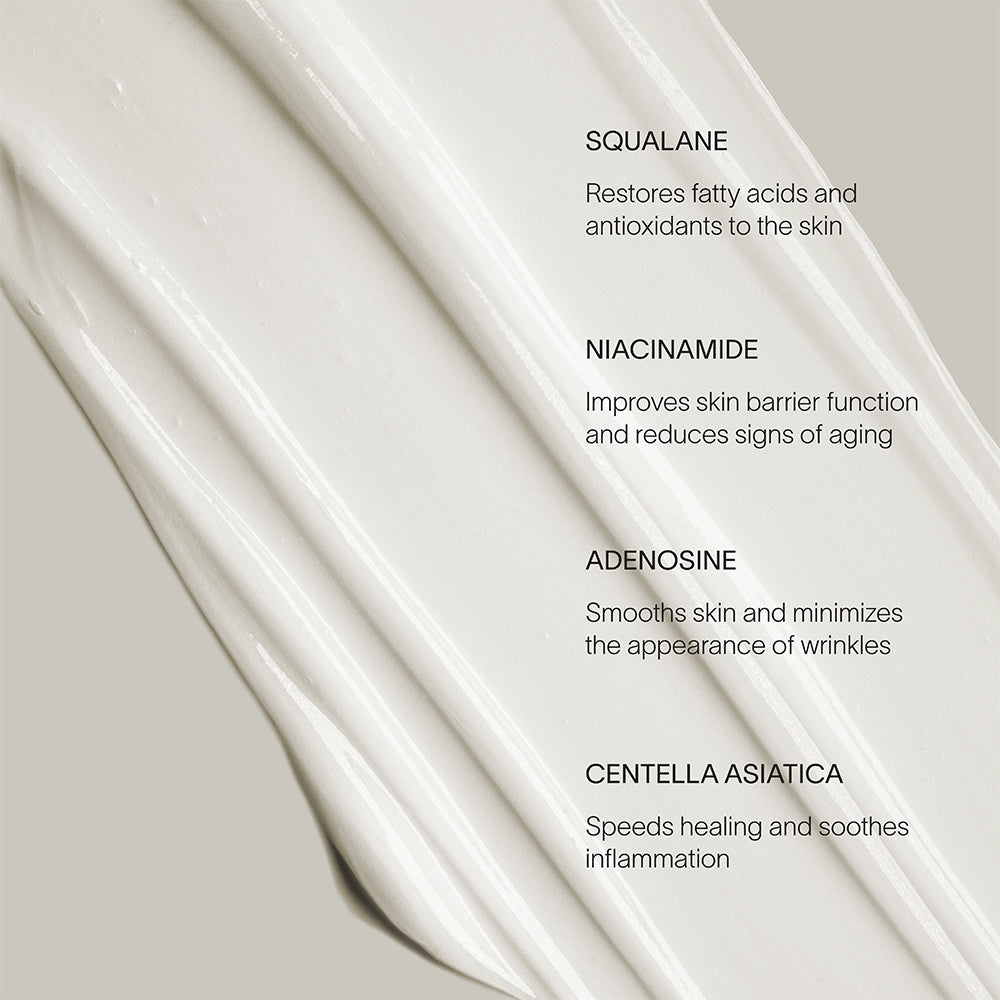• Aqua/Water/Eau, Squalane, Butyrospermum Parkii (Shea) Butter, Niacinamide, Glycerin, Cetearyl Olivate, Sorbitan Olivate, Cetearyl Alcohol, Centella Asiatica Extract, Jojoba Esters, Leuconostoc/Radish Root Ferment Filtrate, Adenosine, Allantoin, Lactobacillus, Cocos Nucifera (Coconut) Fruit Extract, Xanthan Gum, Citric Acid